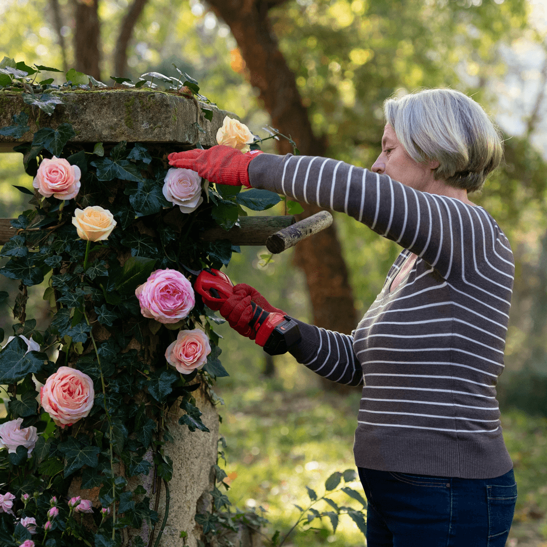 Řez průměru až 27 mm bez námahy díky výkonnému motoru. Možnost přepnutí na částečné otevření (18 mm) pro rychle opakované střihy nebo plné otevření (27 mm) pro silnější větve.